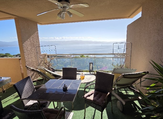 La Société de GESTION IMMOBILIERE vous propose en exclusivité sur célèbre Route des Sanguinaires à la Résidence Barbicaja, un appartement traversant de 3 pièces de 76 m² situé au 1er étage dans une copropriété fraichement ravalée avec parking. le bien est composé d'un hall, un dégagement avec avec placard, une cuisine équipée avec buanderie vitrée et terrasse, une séjour avec une terrasse de 21 m² et une vue panoramique sur la mer, un WC, une salle de bain et deux chambres. l'appartement est vendu avec son garage fermé au sous-sol. Prix de vente 495 000 €, honoraires à la charge du vendeur. Copropriété de 50 lots, charges annuelles 2055 € / an. DPE 123 Kwh / m² / an 3 CO² /m²/ an estimation des coût annuels d'énergie du logement entre 760 € et 1100 € abonnements compris. Les informations sur les risques auxquels ce bien est exposé sont disponible sur le site : géorisques.gouv